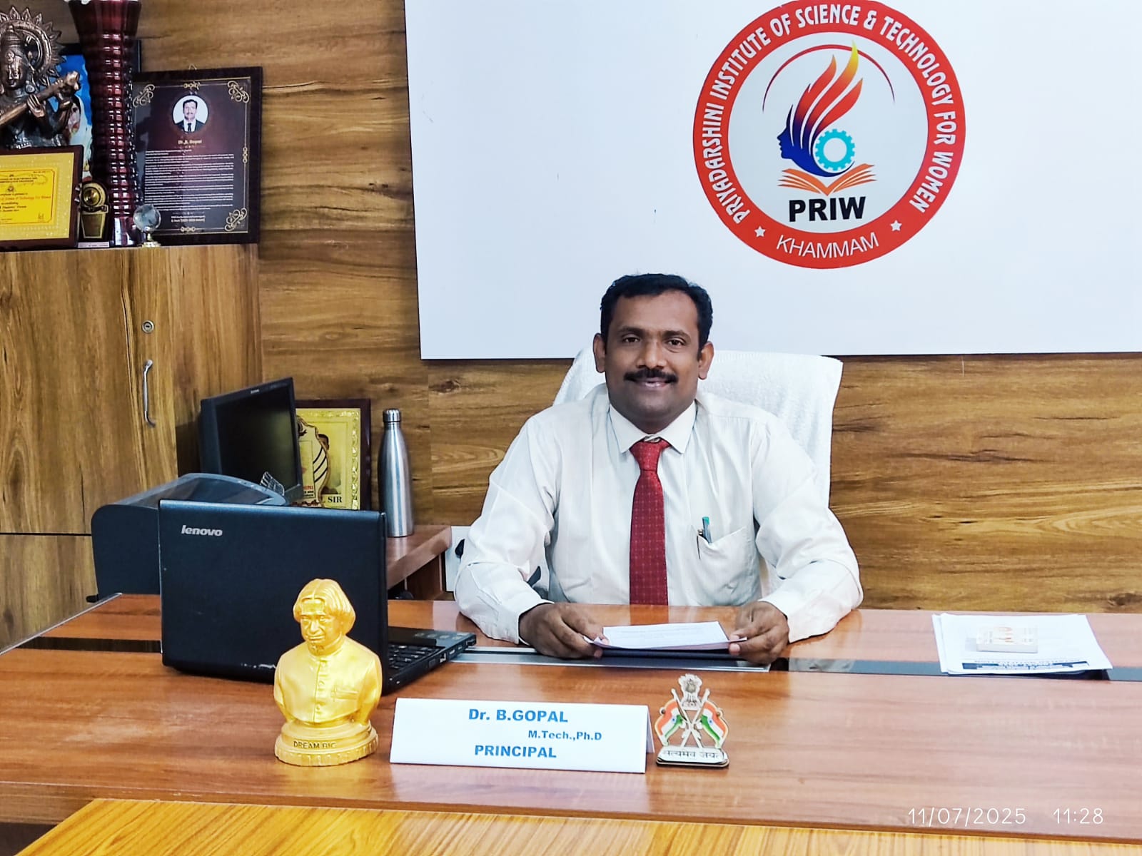 Priyadarshini Institute of Science and Technology for Women (PRIW), Khammam is one more feather in the crown of the Priyadarshini Educational Group, sponsored by J.K. Educational Society, has commenced its maiden voyage during 2009-2010 by a successful academician, abled administrator and dynamic visionary leader Dr. K. Naveen Babu with a team to work for the upliftment of women in the global arena and empower them with knowledge and employment.