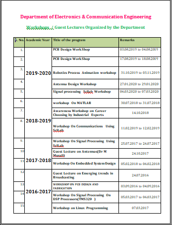 The Department of Electronics and Communication Engineering conducted a Workshop/Guest Lecture as part of its continuous efforts to enrich student knowledge beyond the curriculum. The session focused on providing insights into the latest technological advancements and real-time applications in the field of Electronics and Communication. An expert from the industry/academia was invited to share their valuable experiences and knowledge with the students. The event covered key concepts such as embedded systems, communication protocols, VLSI design, signal processing, and emerging trends like IoT and 5G. Students actively participated and engaged in interactive discussions, gaining exposure to practical aspects and current industry expectations. The session proved to be highly informative and motivational, encouraging students to explore core domain opportunities and upgrade their skills.