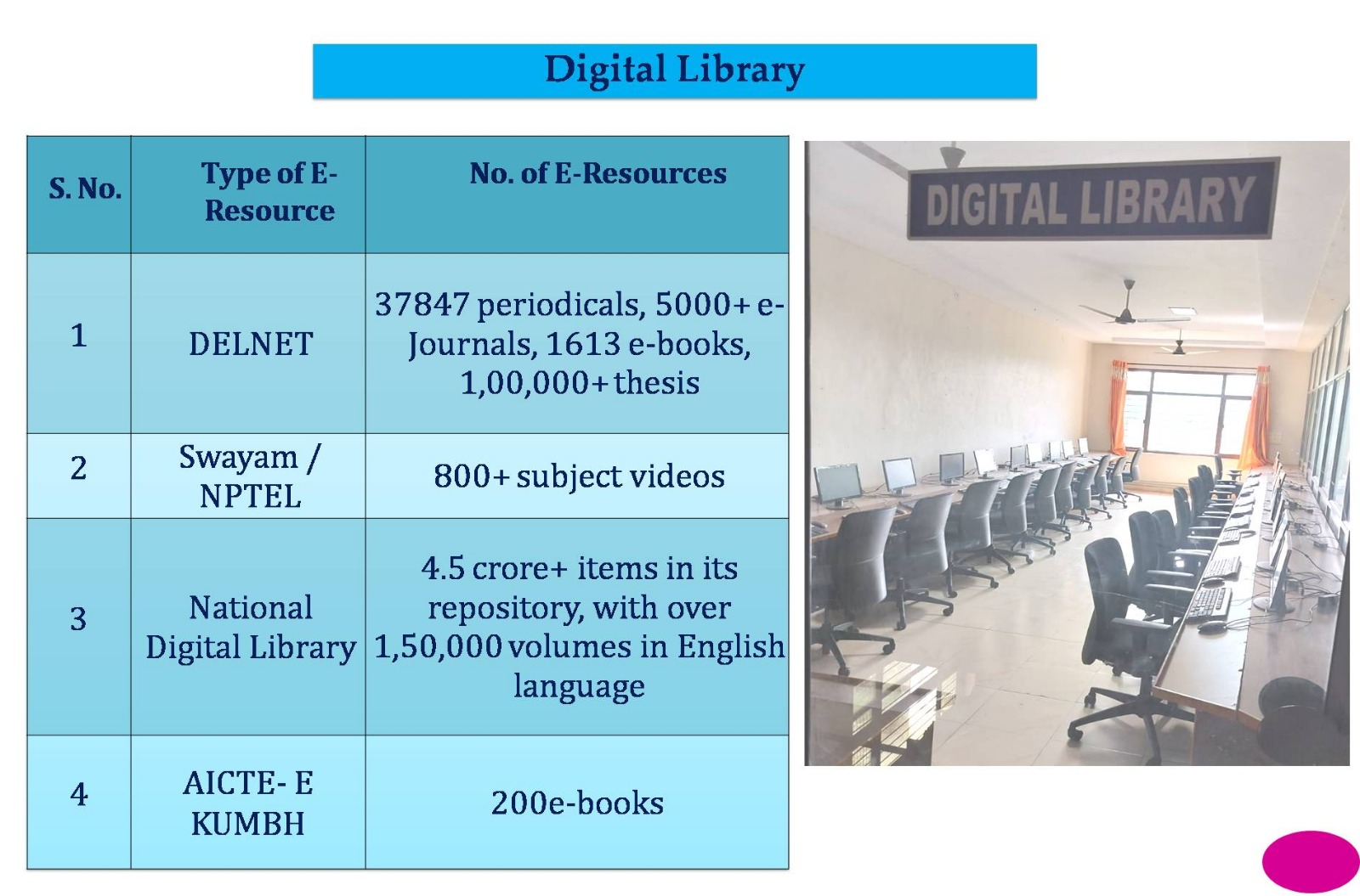 Digital Library was established with 30 computers with high speed Internet connection, Wi-Fi enabled. Digital has many forms and meanings in today advancement in terms of Information, Knowledge sharing data security. All the Non-Book Materials (E-Resources) online journals, Scanned Documents can be stored in the Digital format through Internet cabin. Anyone can access Information about online process in Digital Library.